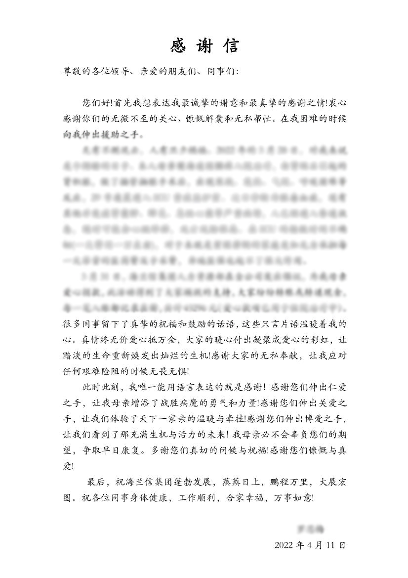 海蘭信集團人力資源部在了解此情況后,迅速在全公司發(fā)出倡議,發(fā)起愛心捐款活動,得到了大家的踴躍支持,大家紛紛轉賬或轉遞現(xiàn)金,每一筆入賬都記錄在冊,愛心款項很快便用于住院治療中。很多同事還留下了真摯的祝福和鼓勵的話語,只言片語溫暖著海蘭信每一位員工的心。