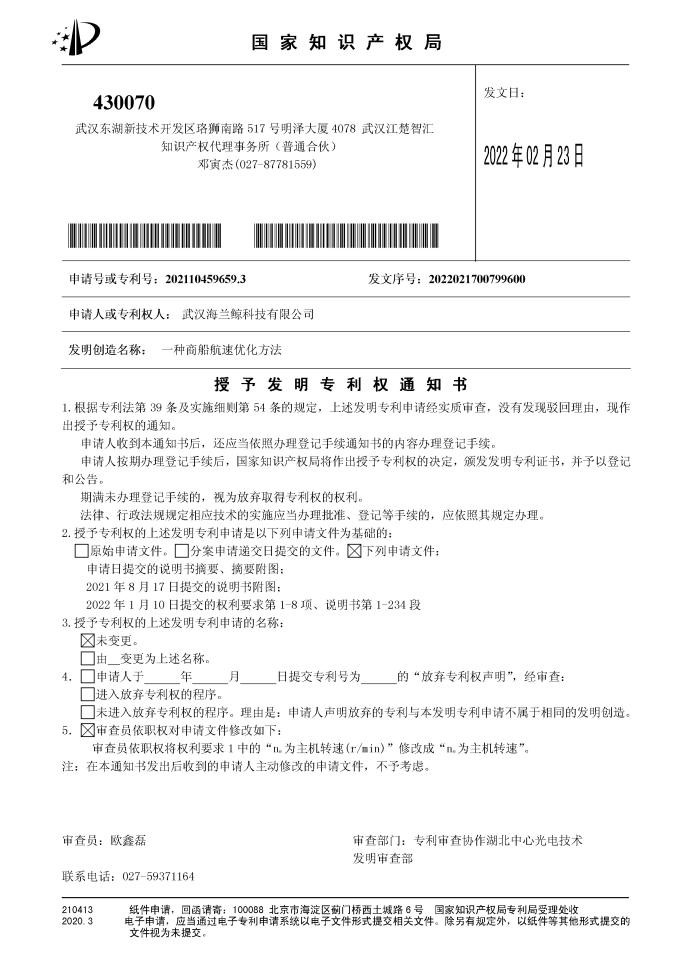 2022年2月23日,經(jīng)過國家知識產(chǎn)權(quán)局權(quán)威專家評審委員會的嚴格評審,海蘭信智能船SBU收到發(fā)明專利權(quán)通知書,專利名稱為“一種基于商船的航速優(yōu)化方案”,專利號為202110459659.3。